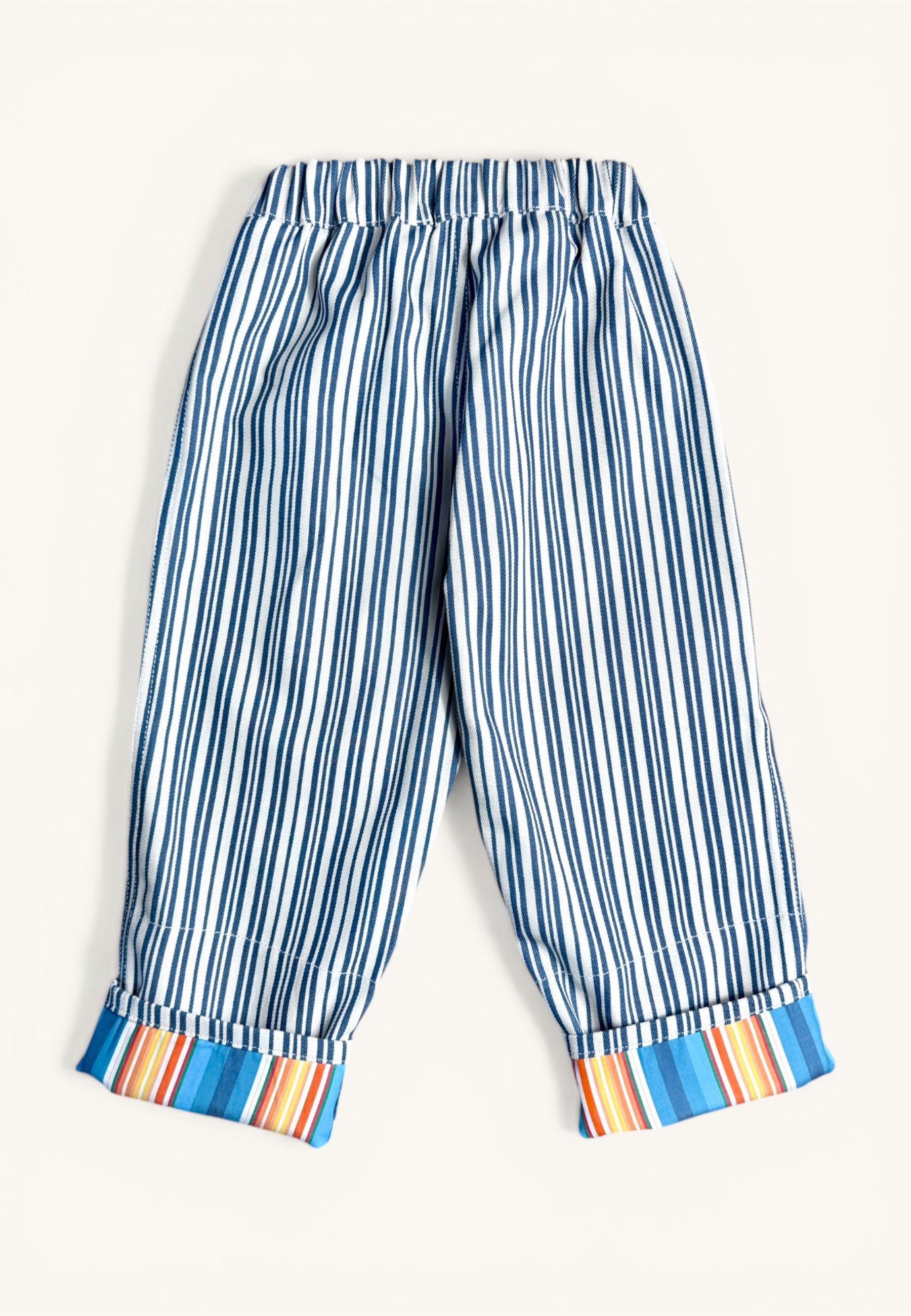 Our Club Trésor pants have been designed to be evolutionary and as durable as possible. Their stretchy elastic waistband adapts to different body shapes and ages. Worn high-waisted for the youngest, they will be worn lower on the waist as your child grows. Its lining on the lapel allows you to make up to 3 lapels to adapt the length.