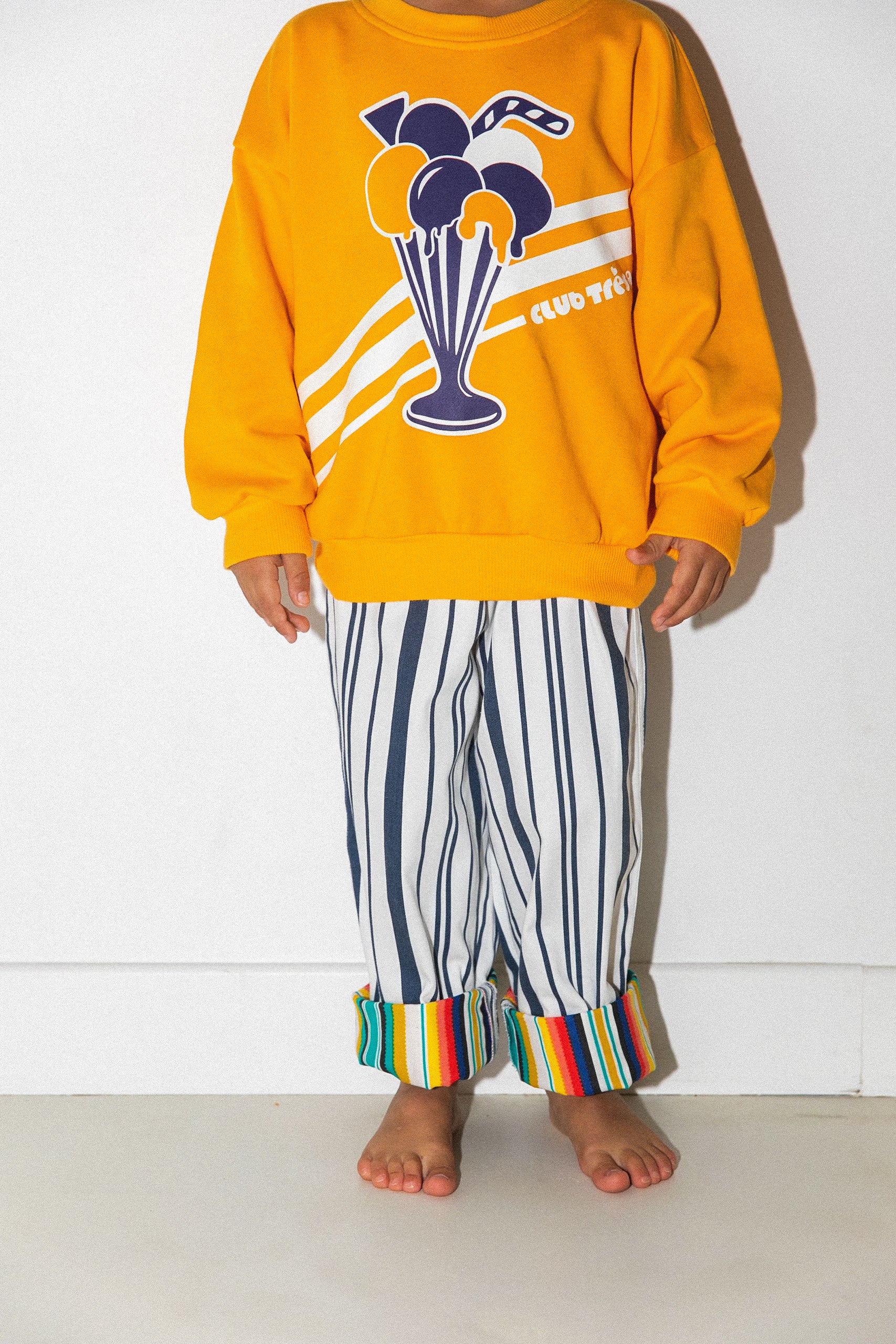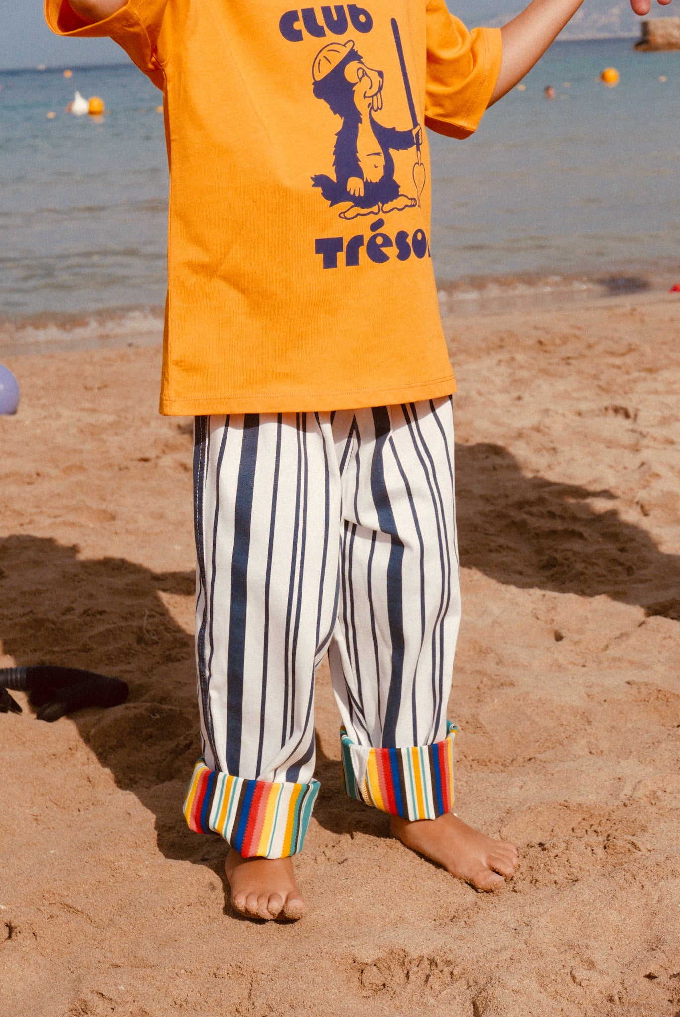Notre pantalon Club Trésor a été conçu pour être évolutif et le plus durable possible. Sa taille élastique extensible est adaptée à différentes morphologies et différents âges. Porté taille haute pour les plus petits, il sera porté plus bas sur la taille au fur et à mesure que votre enfant grandit. Sa doublure sur le revers vous permet d'effectuer jusqu'à 3 revers pour en adapter la longueur.